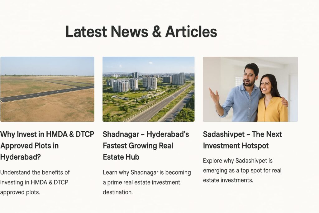 “Discover premium open plots in Hyderabad’s fastest-growing locations, carefully chosen for investment and future growth.Each project is HMDA & DTCP approved, ensuring 100% clear title and complete legal security.Well-planned layouts with wide roads, electricity, and water facilities offer a modern lifestyle.